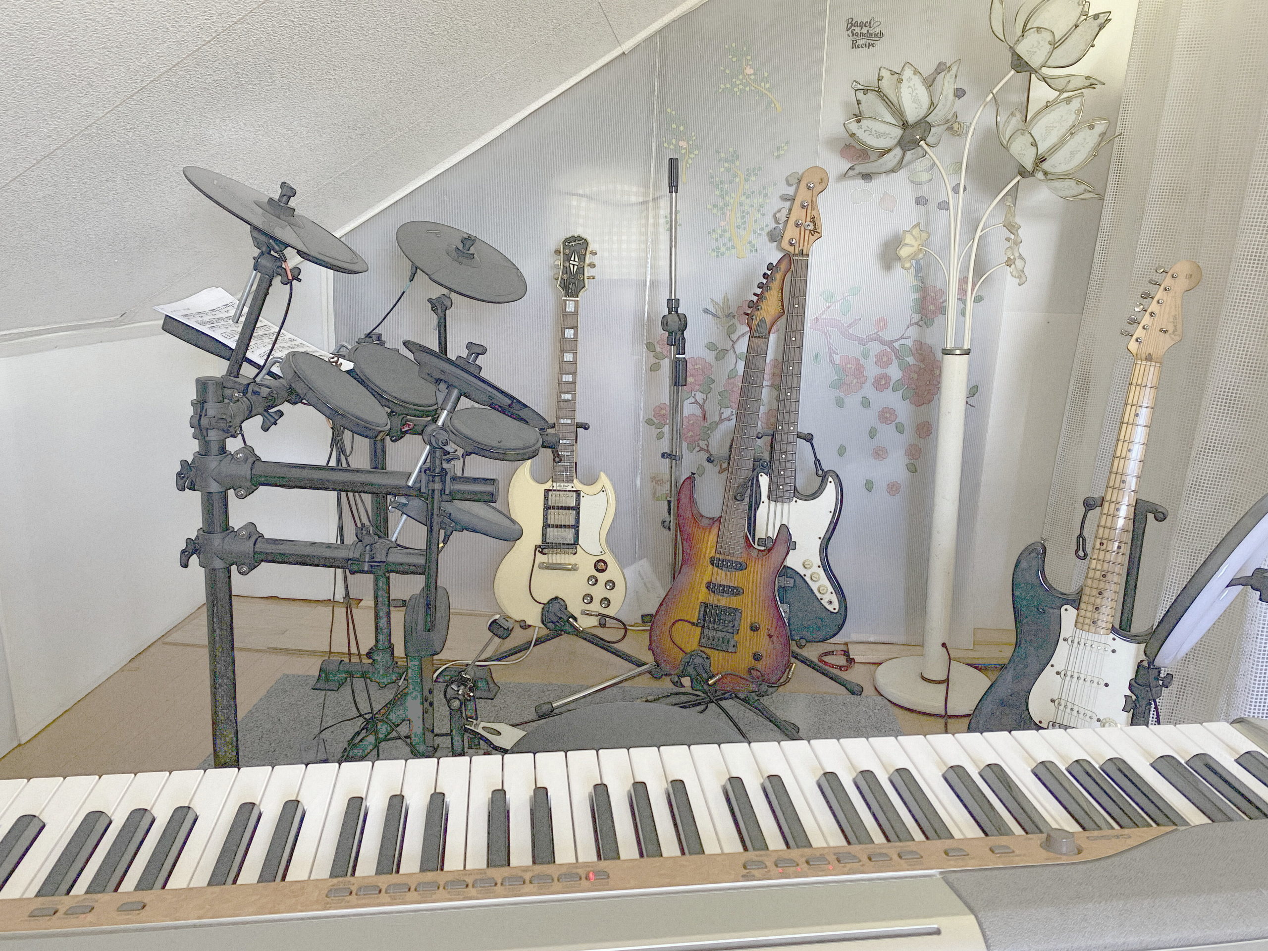 私の場合、楽器はエレキギター、アコースティックギター、電子ピアノ、キーボード、ドラムスが主なものです。どれも自己流であまり上手くはないですが、音が重なって多重録音として1曲が完成するとちょっとした満足感と共に反省点も多く目につきます。