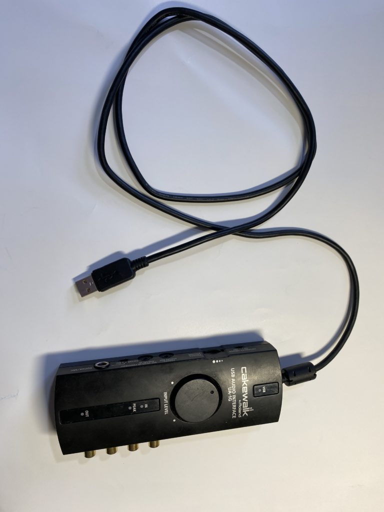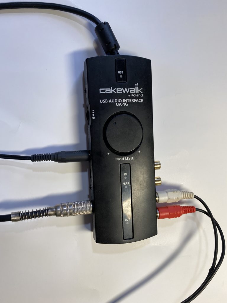 楽器の録音は、楽器のケーブルをオーディオインターフェイスに繋ぎ、そこからUSBでPCの方へ取り込みます。オーディオインターフェイスにはヘッドフォンを繋いで聴き取りますが、スピーカーで聴く場合はそちらのアンプにも繋ぐ必要があります。取り込むためのPCソフトは無料版のCakewalk by BandLabですが、これが無料だとは、と思うくらい優秀で気に入っています。
